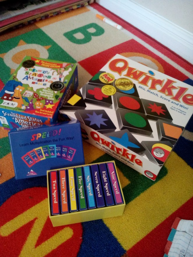 After Fred, my 3rd and 4th graders play Speed, a multiplication card game. For my kinder kid, today we are trying Qwirkle, my latest find at our favorite consignment shop here in town.
