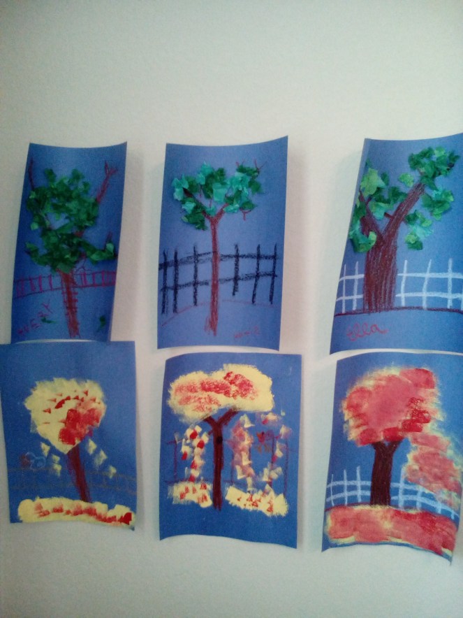 Next, we tried “Trees in All Seasons” (season 2, episode 2). The lesson has several projects to make, however we only had time to complete project for fall and summer trees. These were fun, and added variety with using sponges to paint multicolored leaves on fall trees, and tissue paper to add texture to leaves on summer trees.