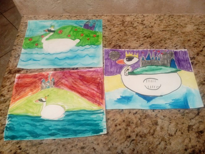 First, we tried “Line and Shape with Swans” (season 2, episode 1). The lesson invovled using washable markers to create a swan picture with a castle in the background. A wet paper towel was used to bleed the marker colors for a watercolor effect.