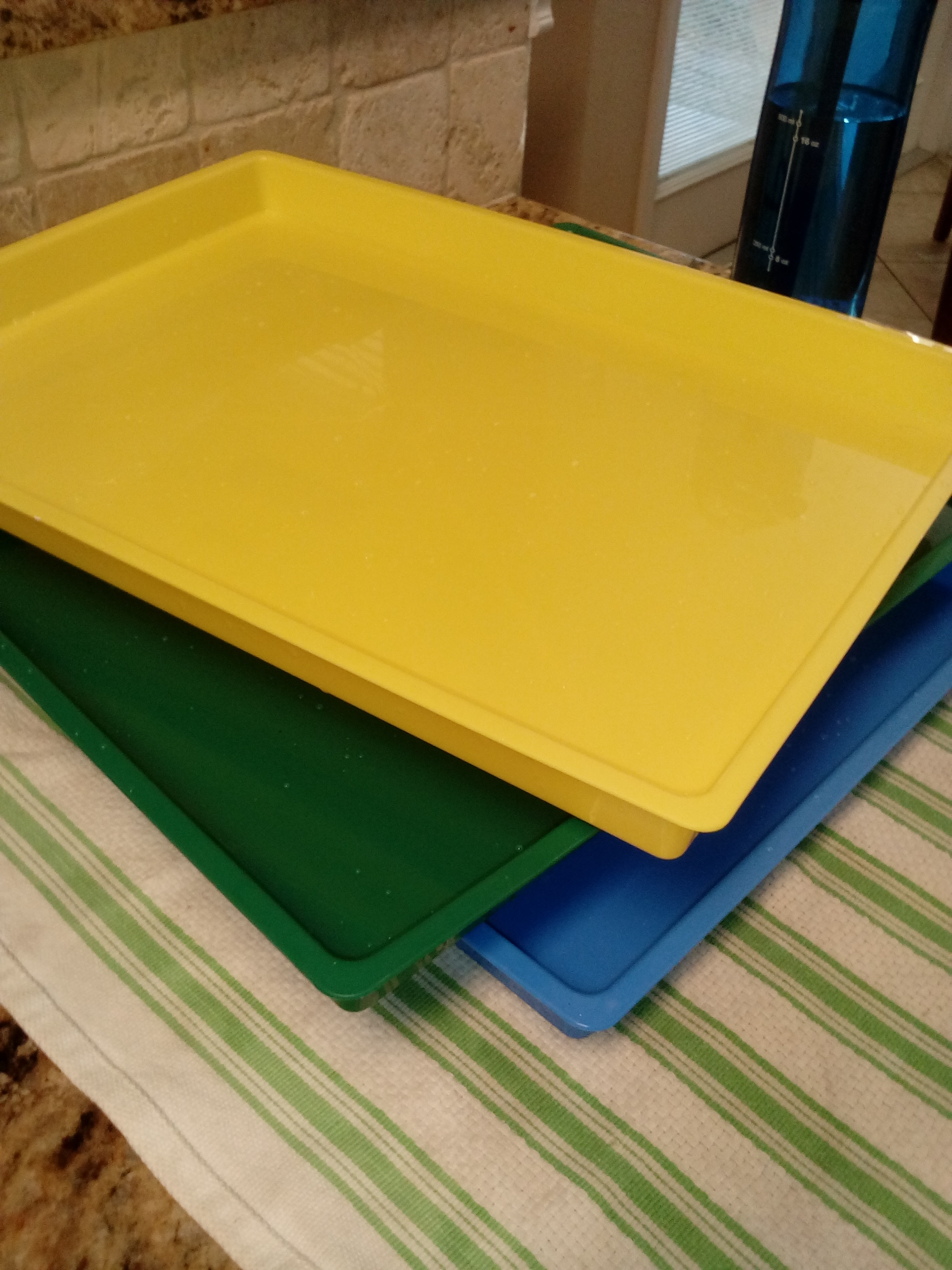 Last summer I bought these trays on sale for $9.99. This is the best thing I have ever purchased for our arts and crafts projects. I almost did not buy them. I thought, “What if I never use them? What if they end up gross and I have to throw them away?” I use them all the time. They clean up like new every.single.time, and every.single.time I am so grateful that I splurged and bought them that day. I used them today, in fact. And the dried-on acrylic paint came right off, and there they are, drying on my counter, in their shiny, primary-colored glory.