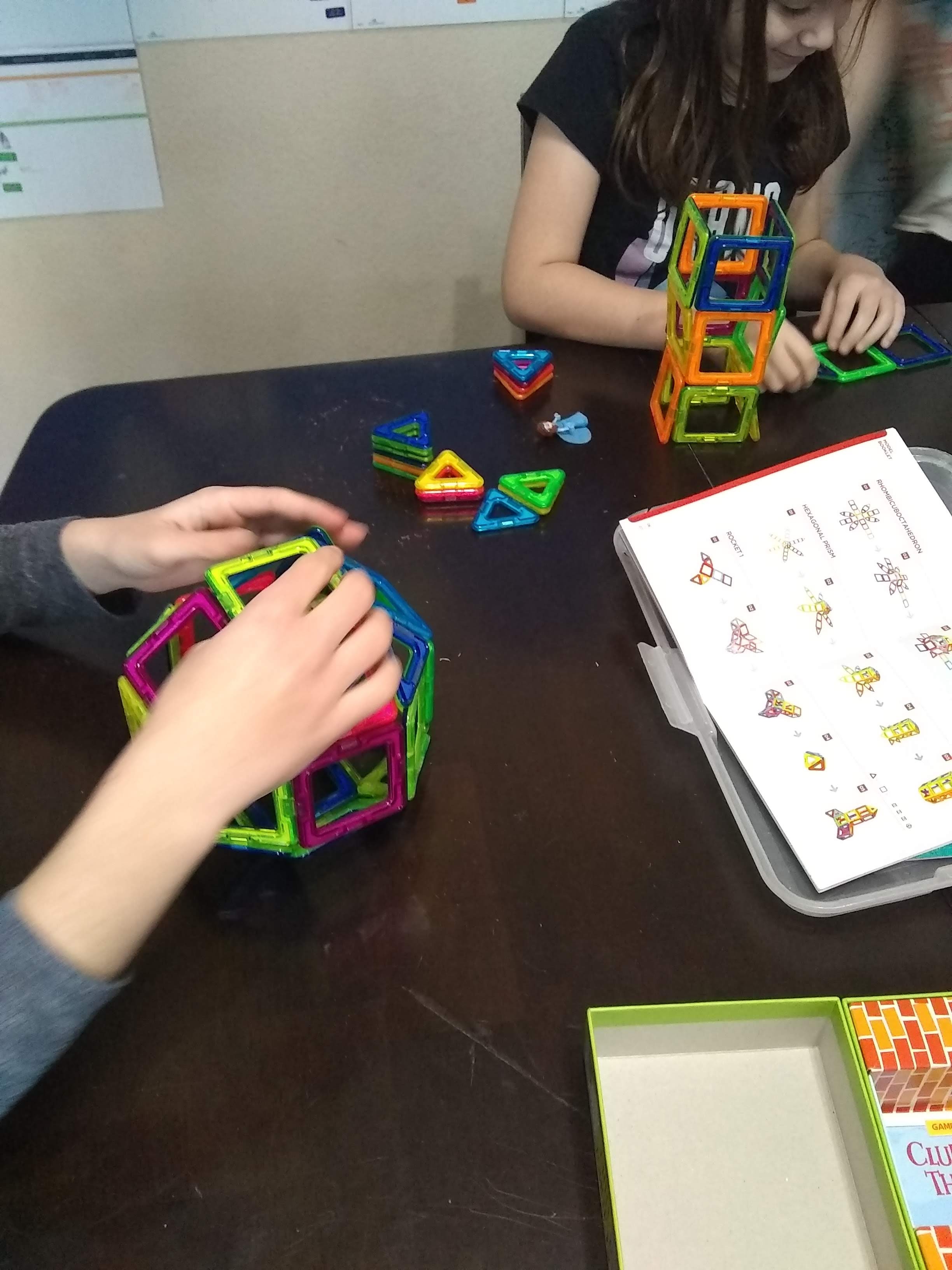 I read “The Sword and the Cone” to the girls, a math story about 3-D shapes and their nets. While I read, the girls played with Magformers to create their own 3-D creations.