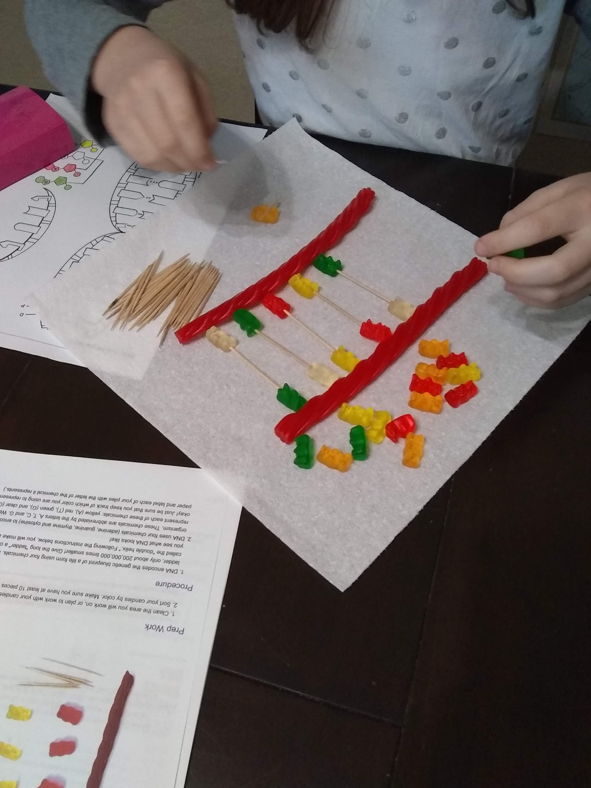 Pairing green gummy bears (for guanine) to white gummy bears (for cytosine), and pairing red gummy bears (for adenine) to yellow gummy bears (for thymine)