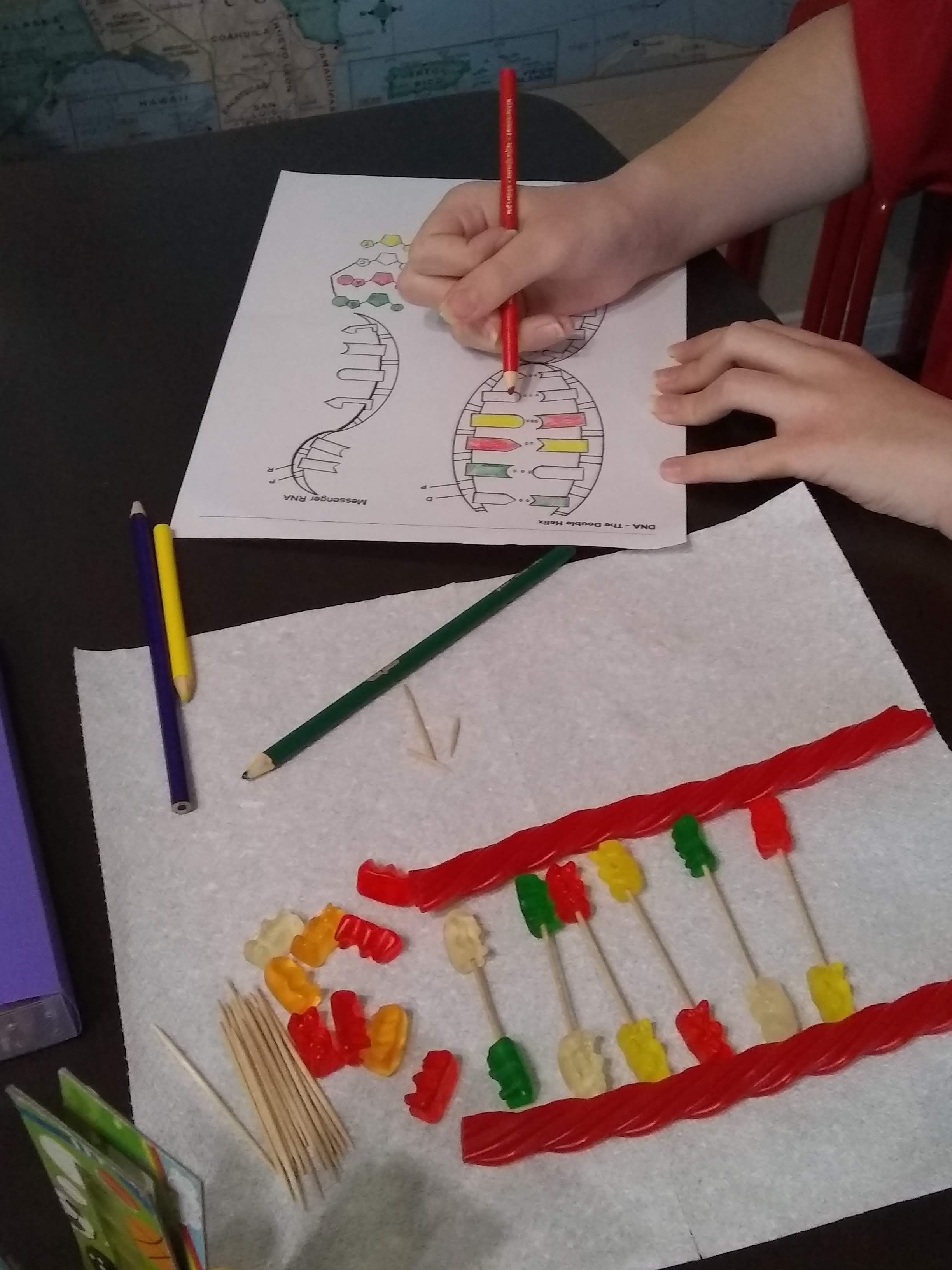 If you can get them to go through your candy bears and into the candy ropes, this would be a great time to lift the model vertically and twist slightly to give a visual of double helix form of DNA. We were not able to make it work, unfortunately.