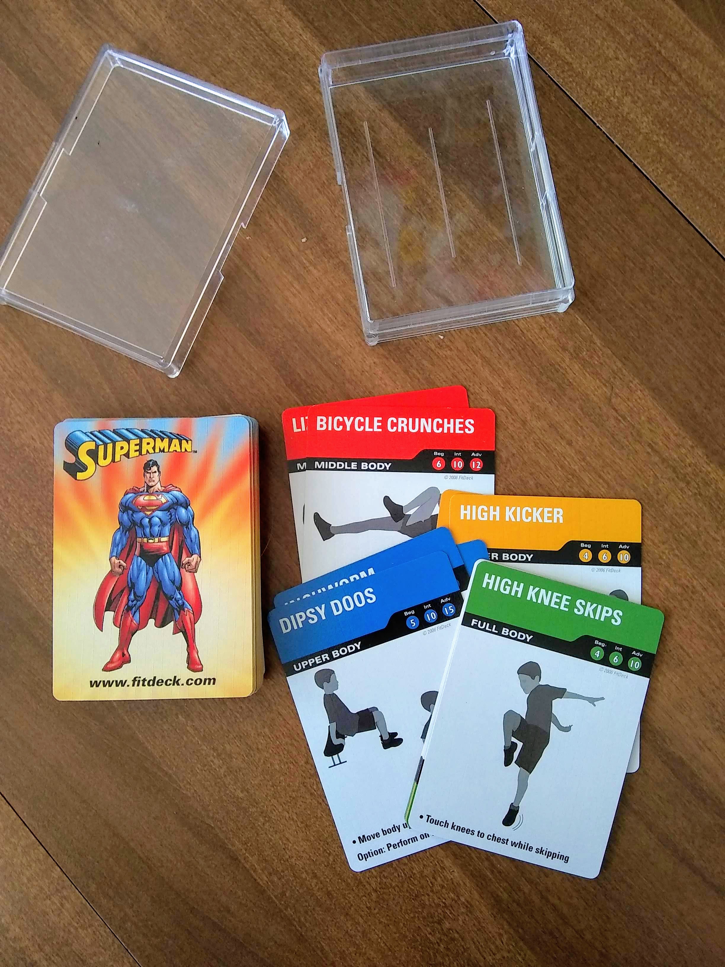 These cards are great! There is a whole deck of different types of exercises that do not require special equipment. Cards can be randomly drawn, or chosen ahead of time. We just randomly selected cards today, but I may spend some time planning the cards for next week. We have used these with our homeschool group as well for P.E. class warm-ups.