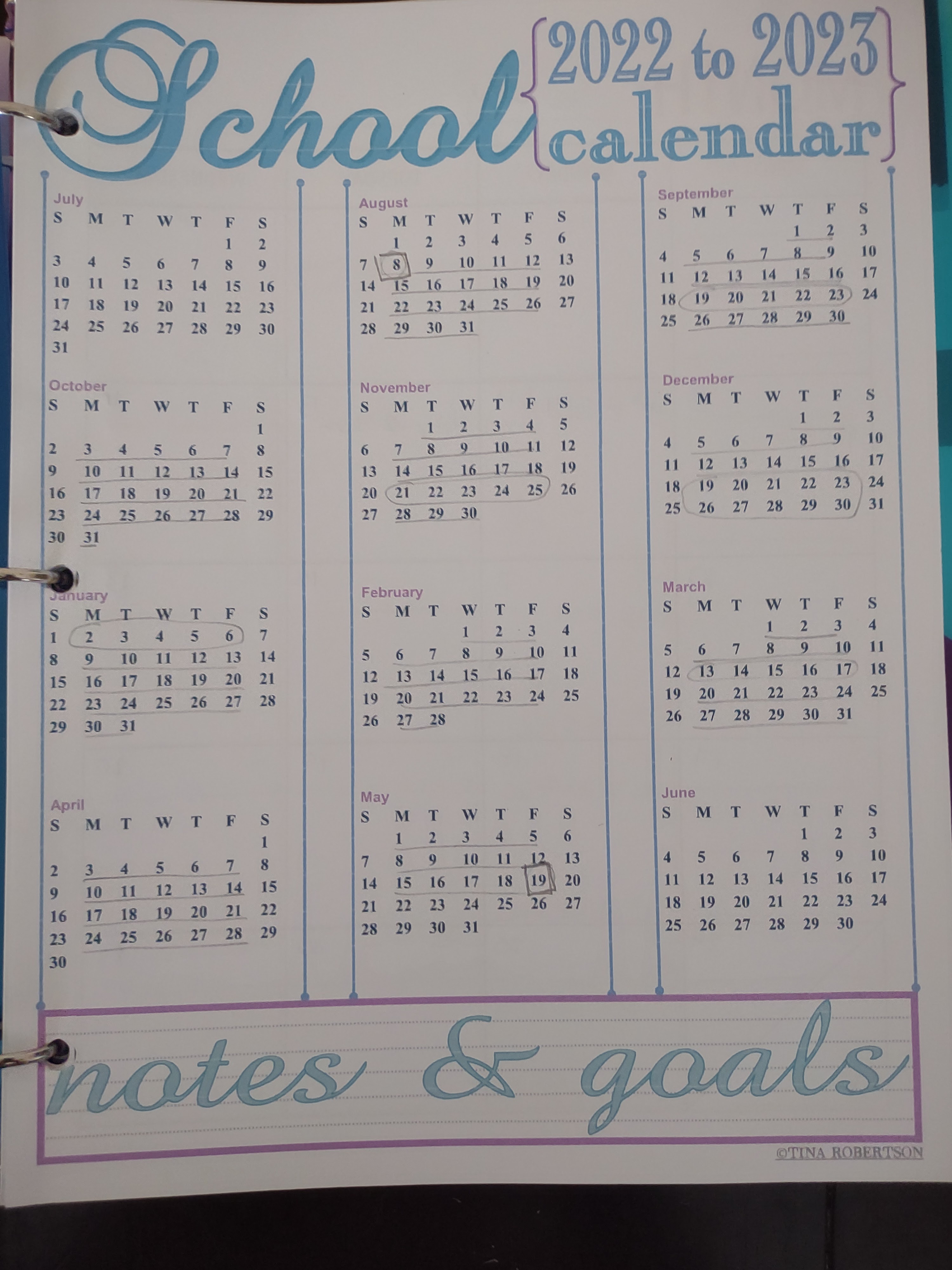 Our planned start day for next year is August 8. I found a 2022-2023 school calendar that I liked here at TinasDynamicHomeschool.com. The colors go well with the rainbow of pastels that I chose as the theme for this year’s planner. I will make a separate post about the planner resources I used, it is just too much to include here.