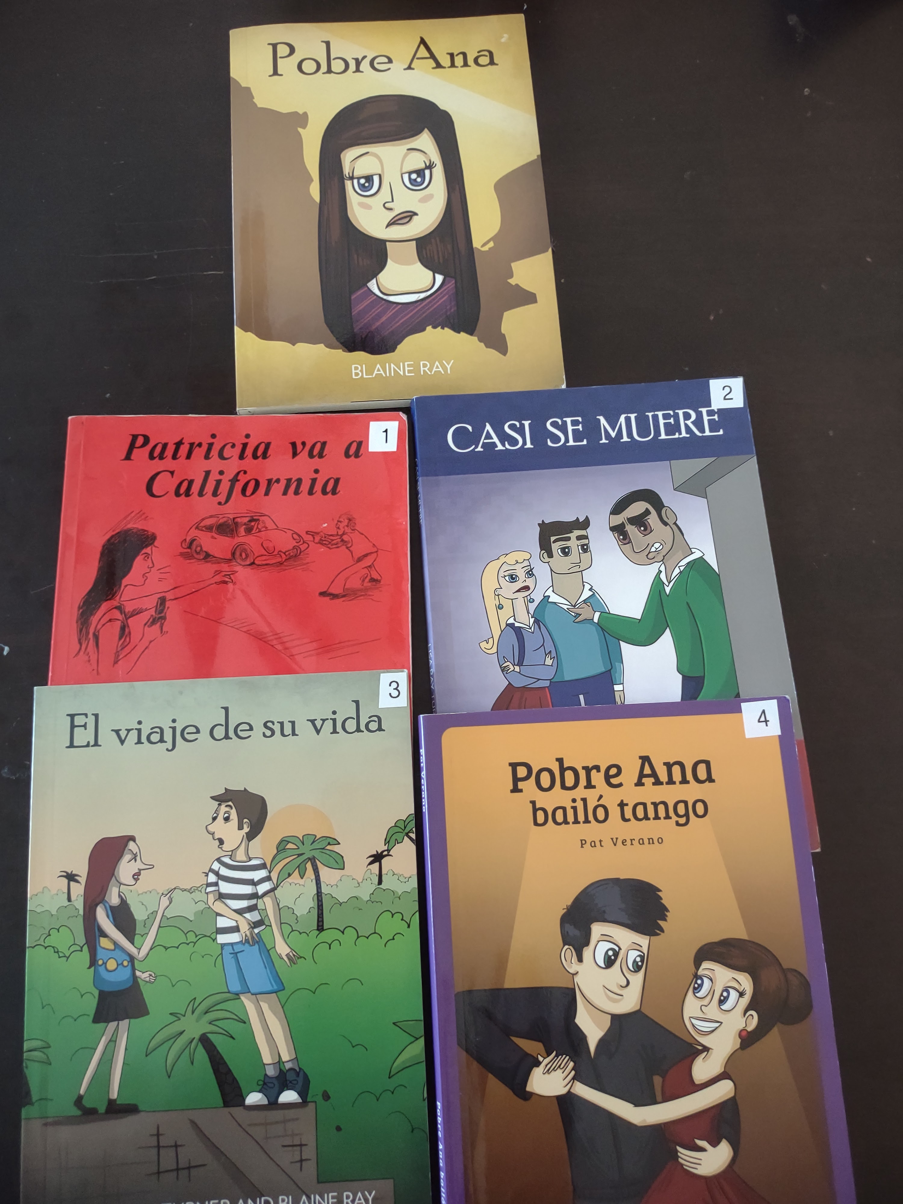 We were also given a few Spanish books by another homeschool family. To practice figuring out unknown words in context before looking them up, I will be adding these to our weekly plans. For Spanish 1, I will add “Pobre Ana” later in the year. For Spanish 2, I will use the other four, one per quarter, in the order that they are labeled in the photo. These and other books can be found on the publisher’s site, TPRSbooks.com