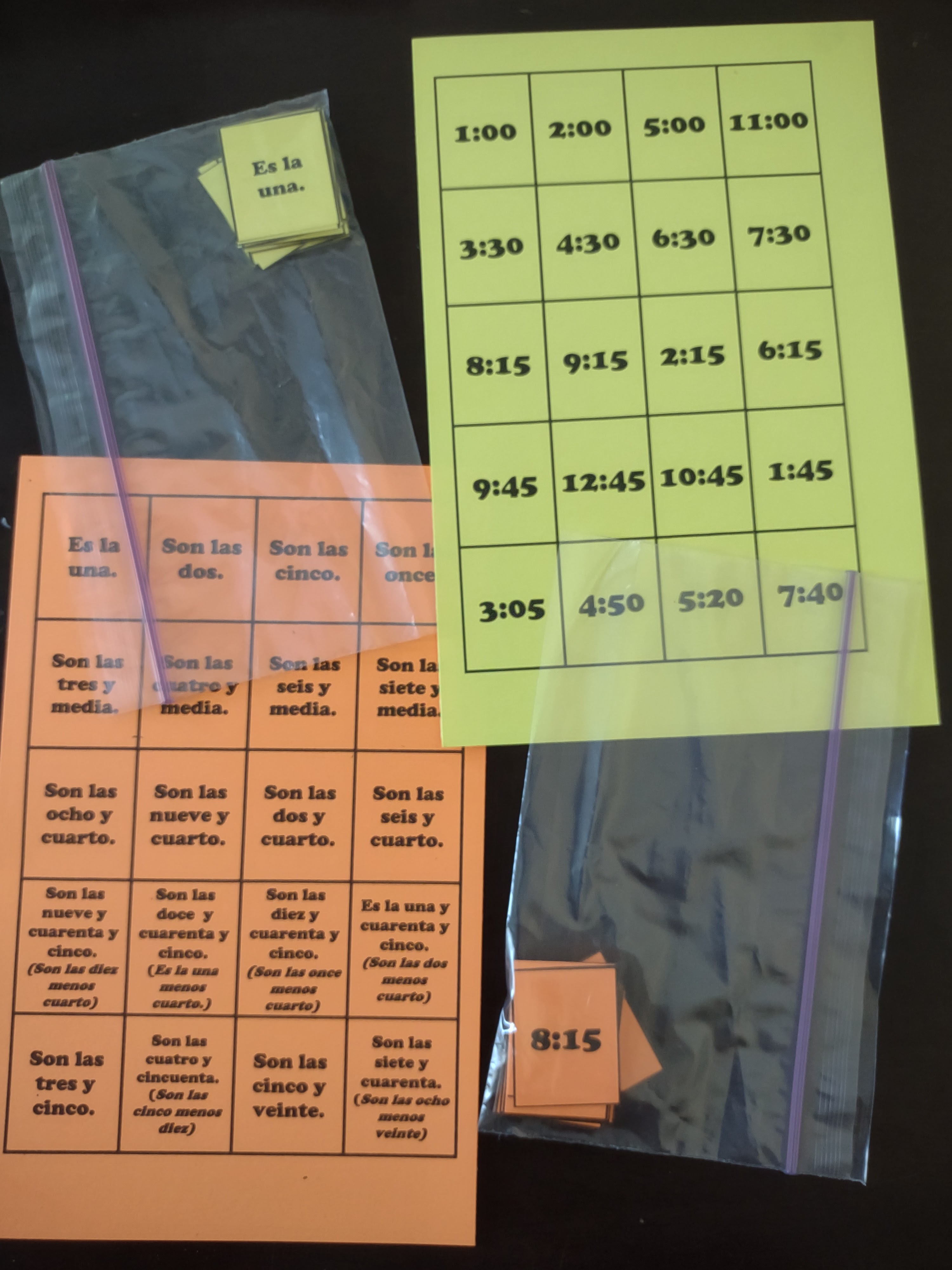 “Yo tengo, que tiene…” (I have, who has…) games for classroom items and telling time (both free at time of writing)