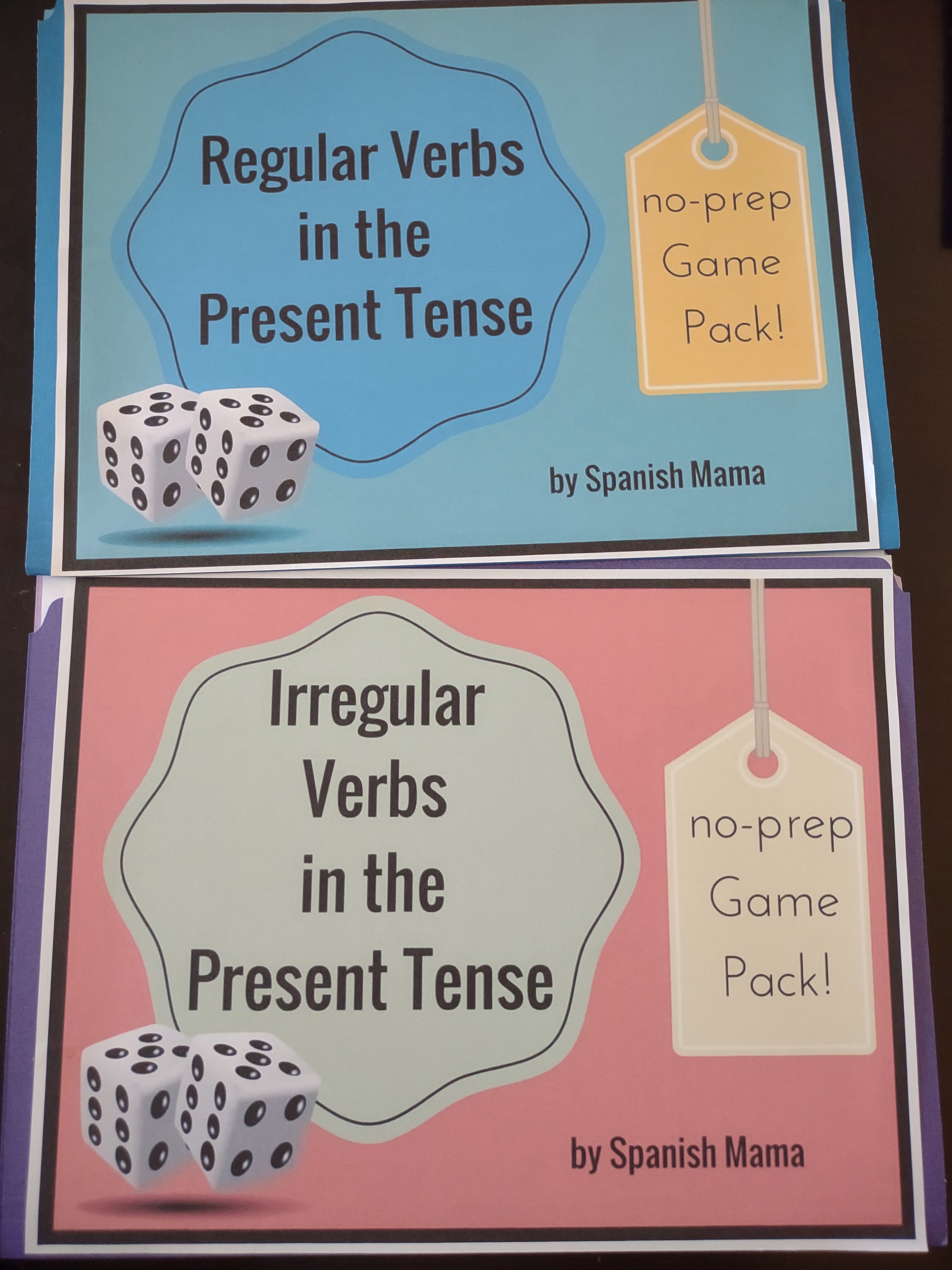 No prep game packs for present tense regular and irregular verbs– I found it easiest to print the whole pack of games and put them into a file folder.