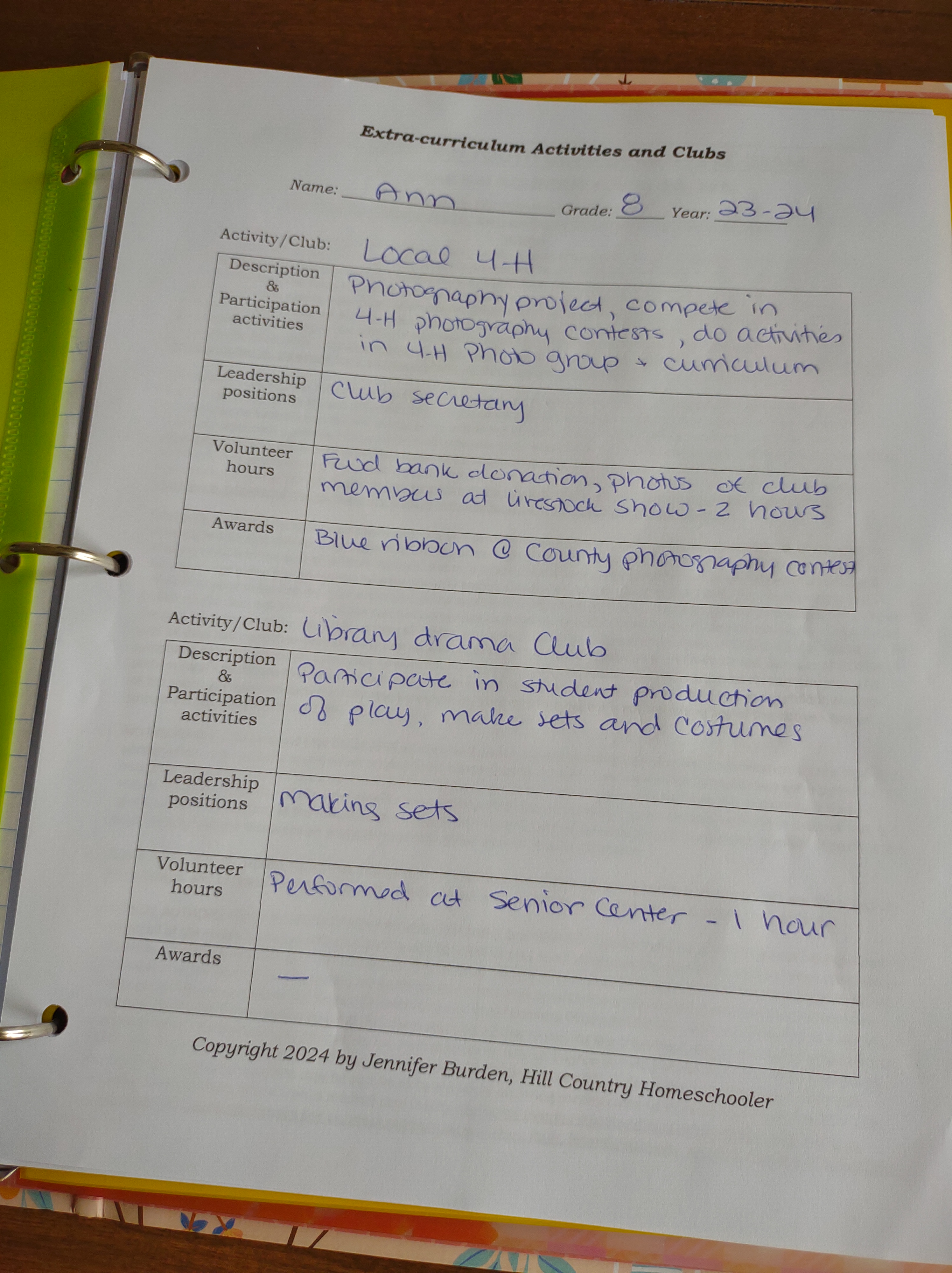 Here are a few example pages I created with a fictional student to demonstrate using the forms and utilizing highlighters to color code.