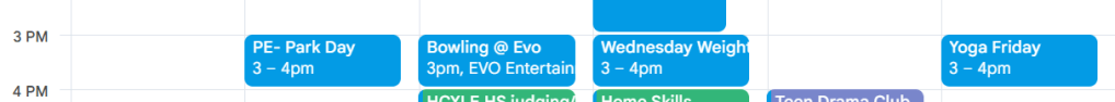 Right now, the plan is to follow our PE schedule at 3pm on the scheduled days. The girls have drama club at a library in a nearby town on Thursday afternoons, so the 3pm slot will not work on Thursdays.