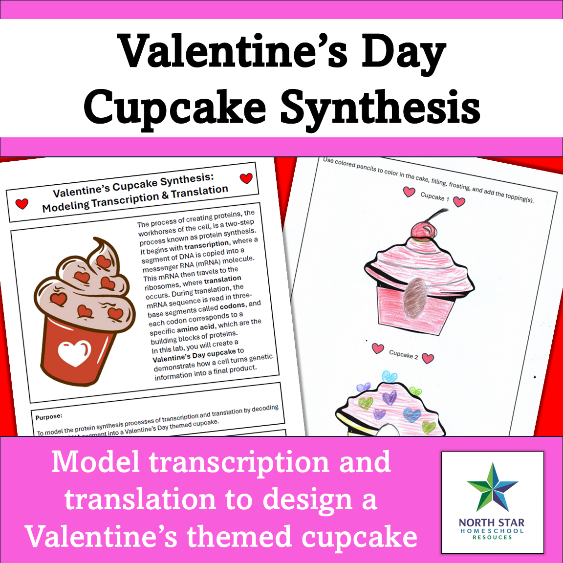 To help use some of that energy for good, I created two activities for biology to review pretty important concepts with a fun Valentine’s Day theme. The first is a review of protein synthesis. Students will start with a fictional DNA strip, transcribe mRNA, and finally use the “Cupcake Codon Chart” to translate the mRNA into a Valentine’s Day Cupcake. Not a real cupcake, although teachers could certainly bring cupcakes for afterwards. Valentine’s Day Cupcake Synthesis is perfect for engaging student imaginations as they color in the components of the cupcakes: cake, filling, frosting, and a topper.