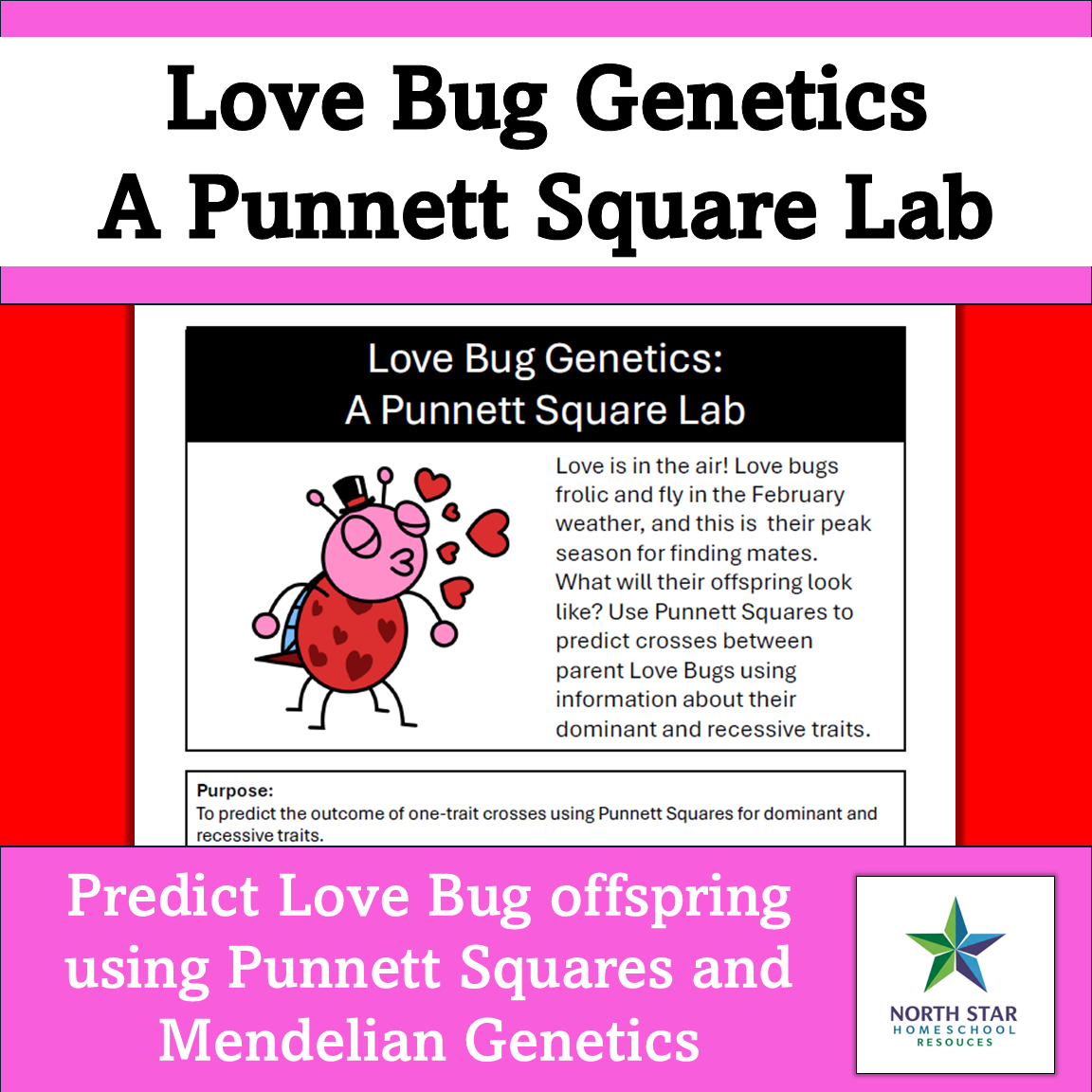The second activity reviews Mendelian genetics and Punnett Squares by predicting the offspring of fictional Love Bugs. In Love Bug Genetics, students will determine the probability of offspring for a variety of characteristics such as heart-shaped wings, body color, and heart-shaped feet. Using a chart of dominant and recessive alleles for all of the characteristics, students will use Punnett Squares to predict genotypes and phenotypes of the offspring. Finally, they will use a die to randomly select the characteristics of their own Love Bug and then draw their custom Bug with colored pencils or markers.